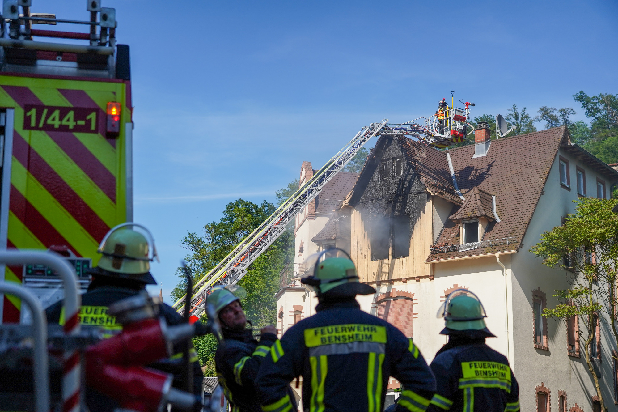Nachlöscharbeiten bei einem Brand einer großen Gartenhütte in Lampertheim im August 2022.